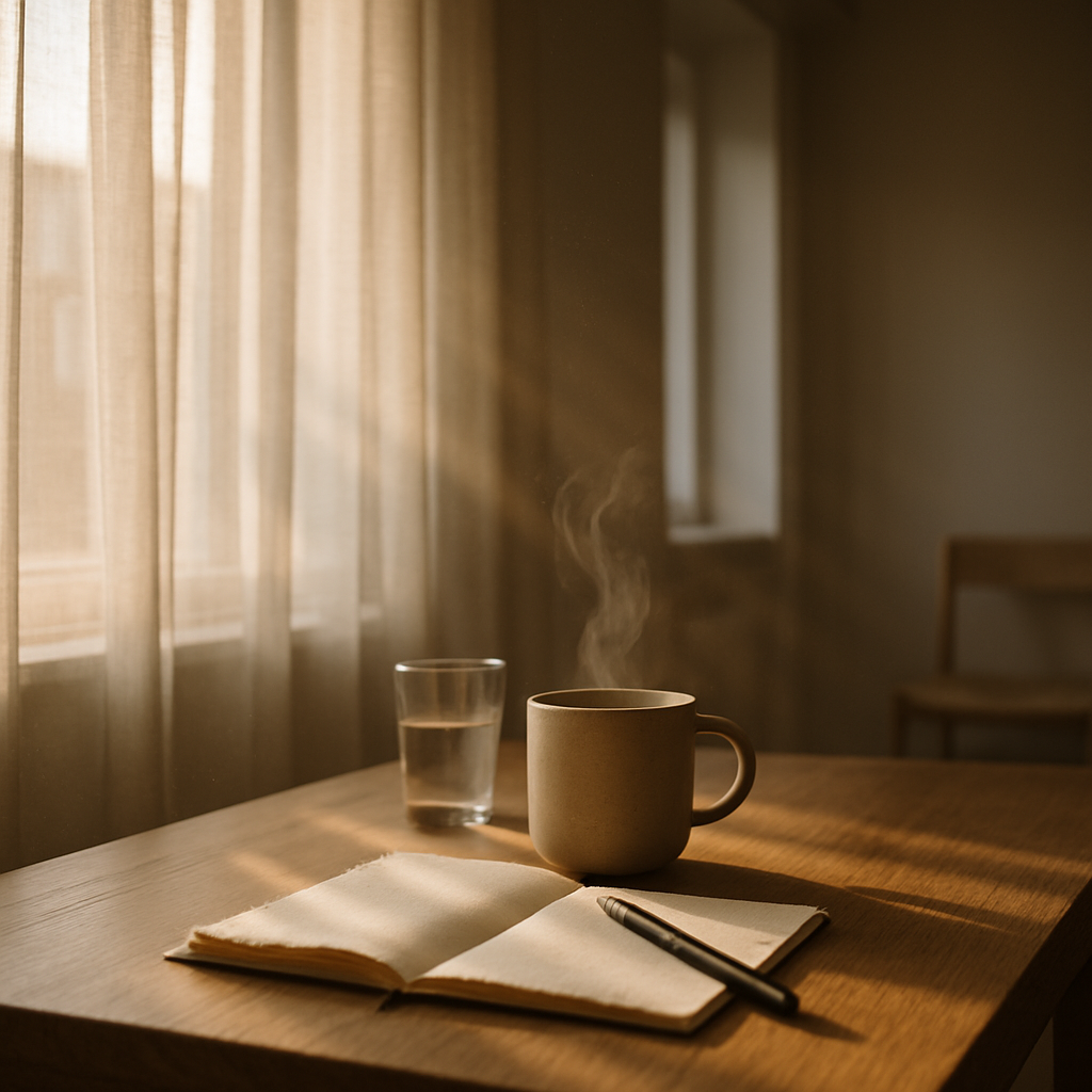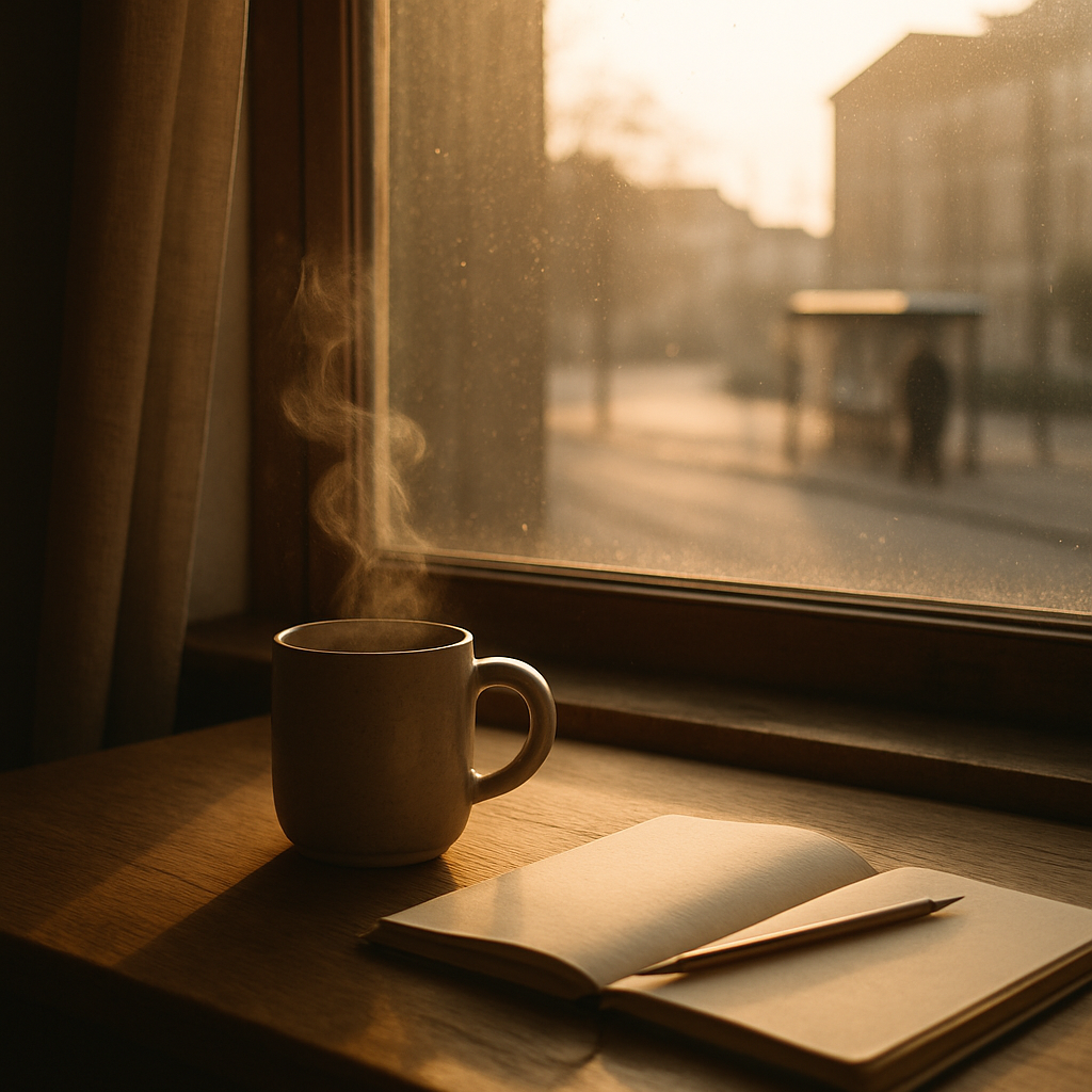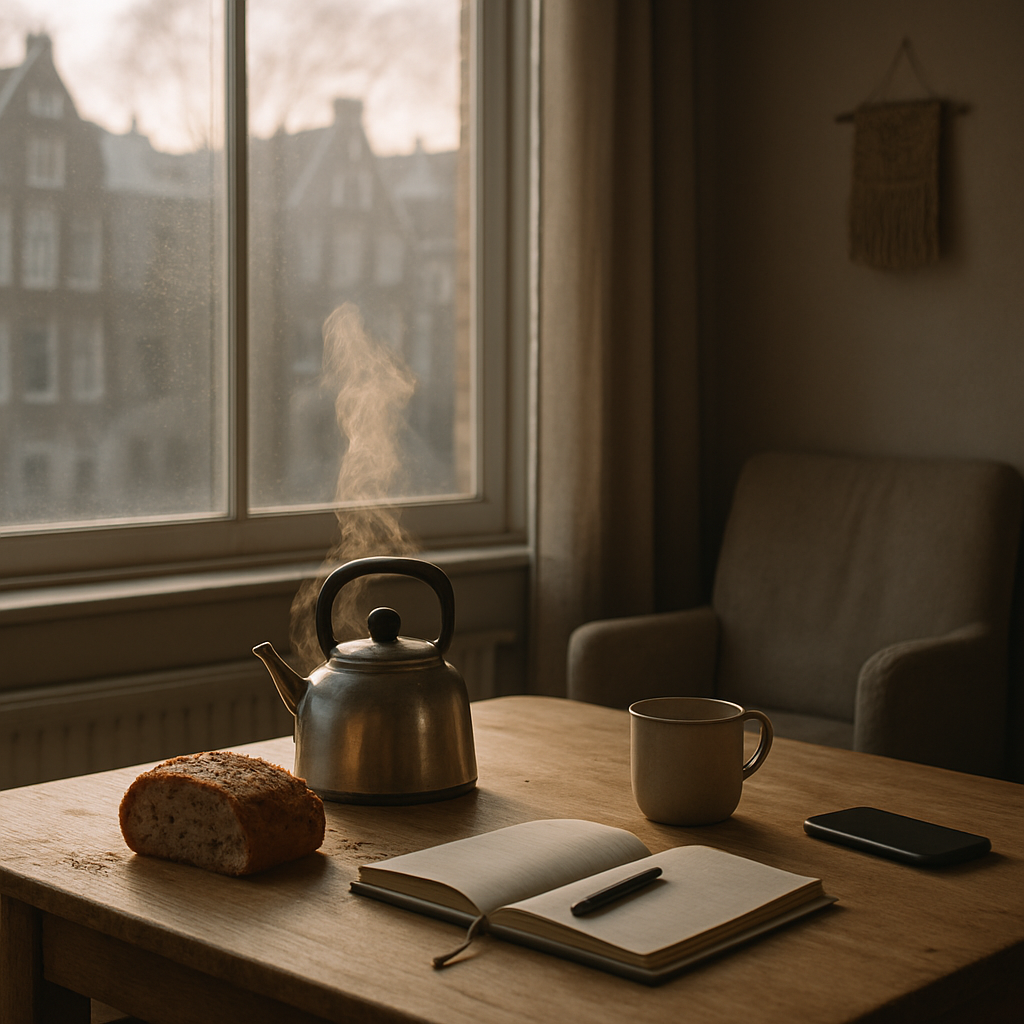 De ochtend opent zich als een langzaam uitgespreide kaart: vouwen die zich schikken, witte plekken die beloven dat er niets hoeft te worden veroverd. Door het raam glijdt licht in reepjes over de tafel; stofdeeltjes draaien hun eigen planetenbanen. De ketel prevelt een belofte, de klok telt de klinkers van de stilte. Ik merk hoe traagheid geen gebrek is, maar een werkwoord: het lichaam dat besluit te blijven, de gedachte die niet jaagt, de hand die de mok omrandt als een cirkel die niet gesloten wil worden.